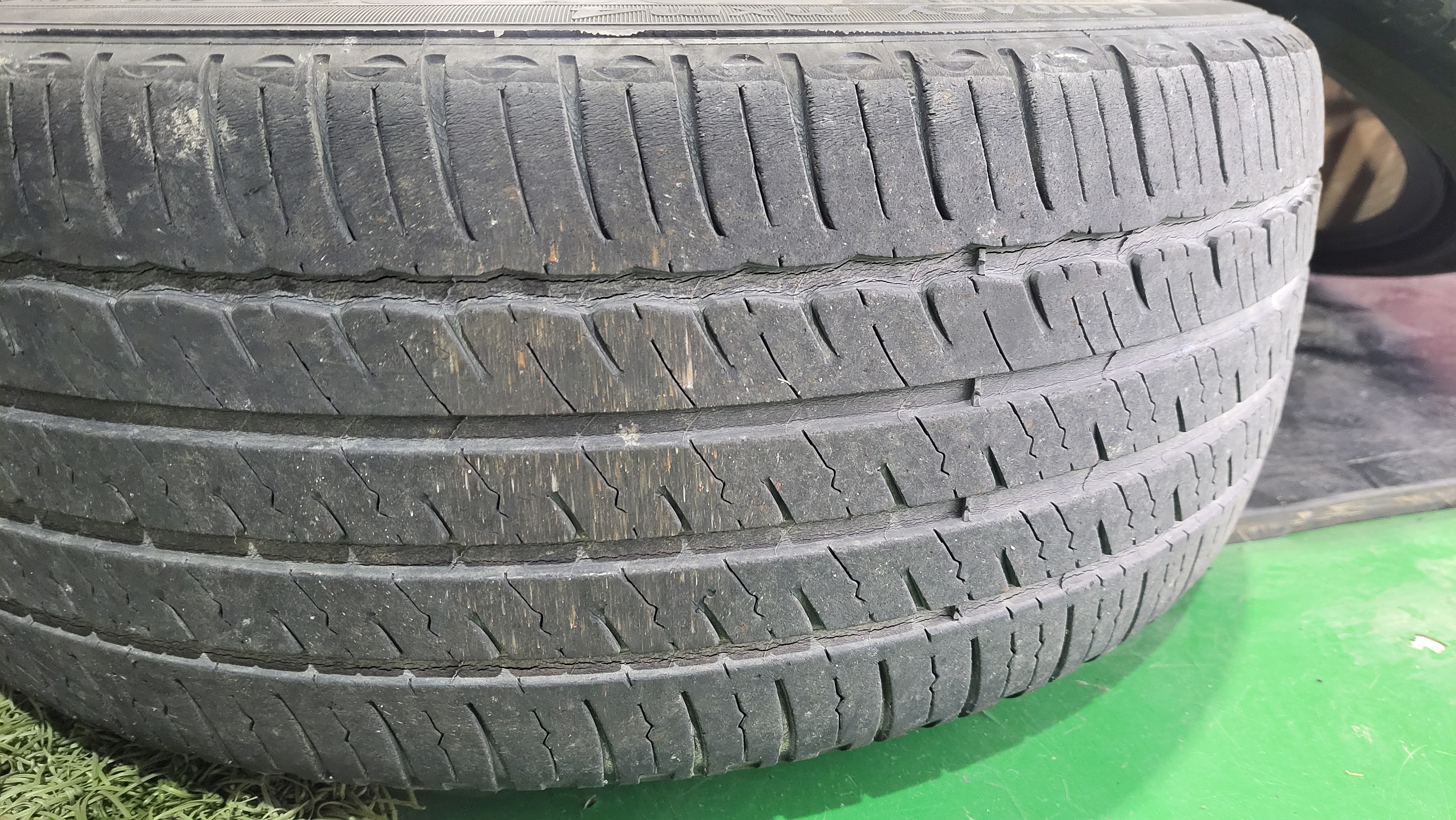 스레드(thread, 타이어에 파인 홈) 사이에 갈라진 자국을 보면 매우 많이 삭았다는 걸 알수 있다.